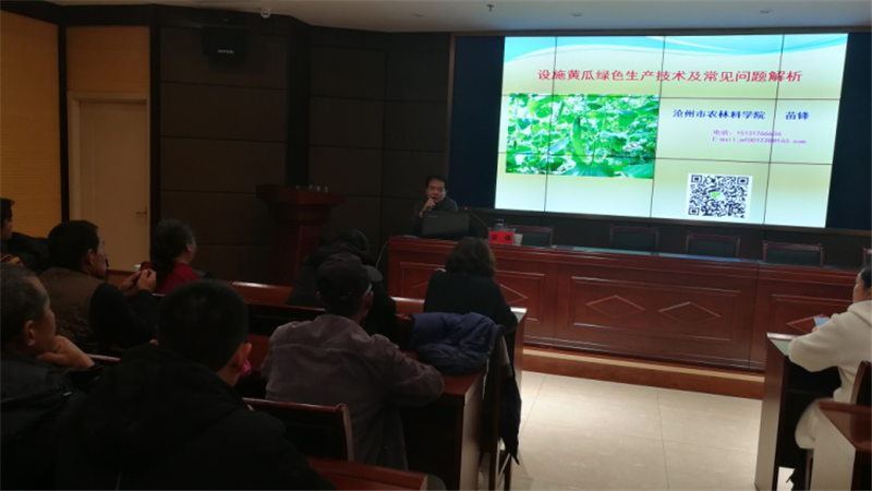 应青县农业农村局邀请,e77乐彩蔬菜花卉研究所所长、蔬菜专家苗锋分别于2019年11月26日和11月30日两次到青县进行新型农业经营主体带头人培训。培训课程为《设施黄瓜绿色生产技术及常见问题解析》和《大棚甜瓜春提早绿色生产技术》,两期培训学员分别来自青县各乡镇蔬菜种植大户,示范园区、家庭农场、种植专业合作社负责人共计300余人。培训结束后,苗锋所长就学员提出的冬季棚室灾害性天气的管理、茬口安排及病虫害绿色防控技术等问题进行了一一解答,现场气氛热烈,培训取得了很好的效果,收到了青县农业农村局及学员们的肯定和好评。