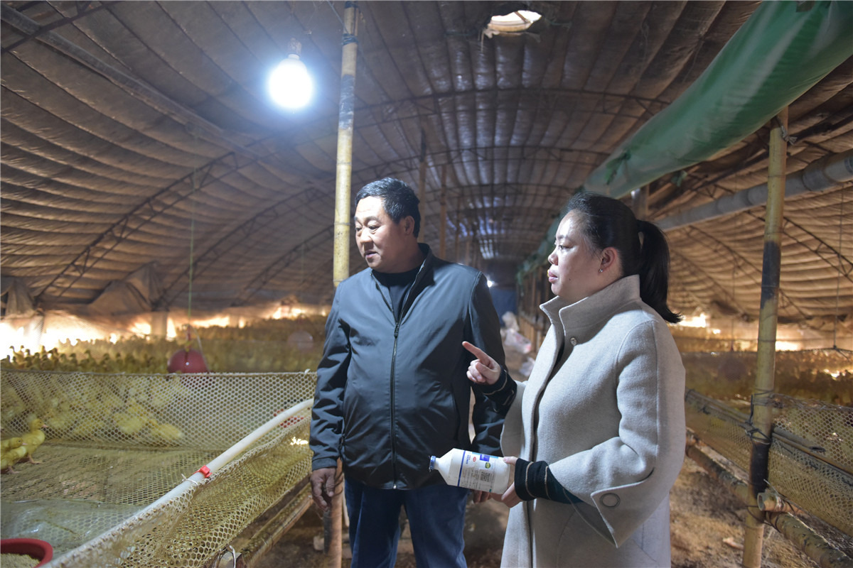 鸭子养殖一直以来也是该村的主要收入来源之一,在养鸭棚,畜牧兽医专家王洪芳老师建议:春季天气多变,切忌忽冷忽热,做好雏鸭舍保温工作;春季流行病多发,要加强鸭舍内外环境消毒;做好雏鸭免疫工作,3日龄肉鸭需颈部皮下注射鸭病毒性肝炎疫苗,注意观察面以后鸭群变化等。