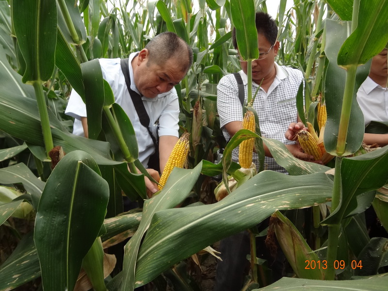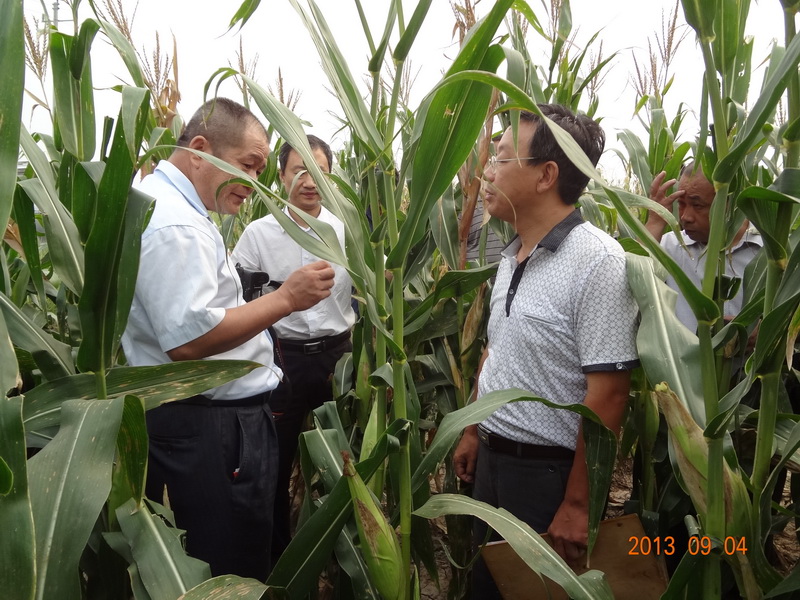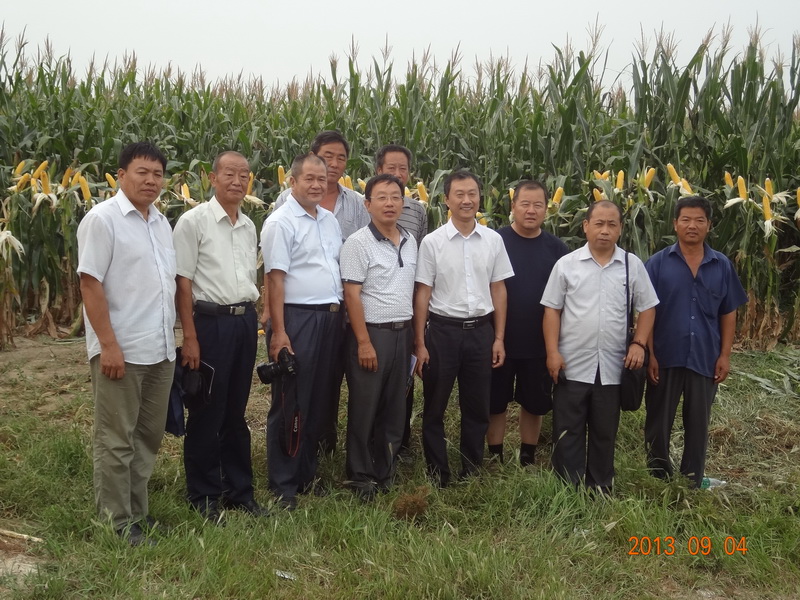 2013年9月4日,我院国家科技支撑计划《渤海粮仓科技示范工程—低平原区雨养旱作增产增效技术模式研究与示范》(课题编号:2013BAD05B0504)课题组邀请有关同行专家,对在黄骅市二科牛村示范区开展的《夏玉米宽窄行增密及配套种植技术》和《夏玉米一穴双株增密种植技术》示范田进行了田间检测。著名玉米栽培专家河北省农林科学院粮油作物研究所杨利华研究员任检测组组长,省农科院和沧州市农业局等有关同行专家参加检测。检测采用五点检测法,分别测定亩穗数、穗粒数,计算理论亩产量,最后按85折计算实际产量。经检测,由我院承担完成的《夏玉米宽窄行增密及配套种植技术》和《夏玉米一穴双株增密种植技术》在黄骅雨养旱作示范区二科牛村160亩示范田上平均亩产分别达 772 kg和748kg,分别比周边常规种植的玉米田增产65.1%和 70.4 %。