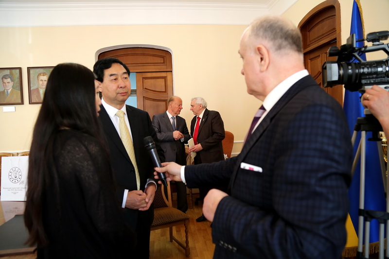 | 院长接受当地电视台采访 | 院长与乌克兰师大副校长 | 院长祝贺乌克兰师大校庆 |