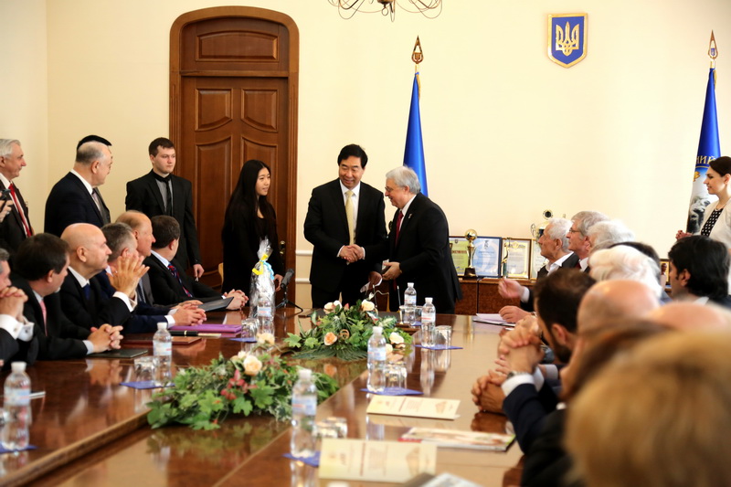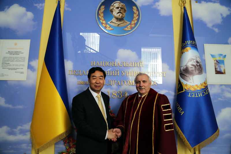 2015年4月23日,霍院长一行应邀参加了乌克兰德拉甘玛诺夫师范大学180周年校庆。该校自本月14日至23日,各项庆祝活动陆续展开,规模宏大而隆重。其中令人感到骄傲和自豪的是,在23日的压轴庆祝活动中,霍献育教授作为特约嘉宾被授予该校荣誉教授,其隆重的授衔仪式令在场的中国留学生潸然泪下。霍院长是该校建校以来唯一一位华籍荣誉教授,且是当天在场20多所来自德国、法国、英国、波兰、意大利、奥地利、哈萨克斯坦等合作院校的几十位与会代表中唯一被授衔的亚洲嘉宾。校庆活动伊始,霍院长首先发表热情洋溢的致辞,对校庆活动表达了诚挚美好的恭贺,对双方的合作办学前景给予良好祝愿,并赠送礼物以表友好。霍院长之后,各国合作学校的代表纷纷上台致辞、献礼。