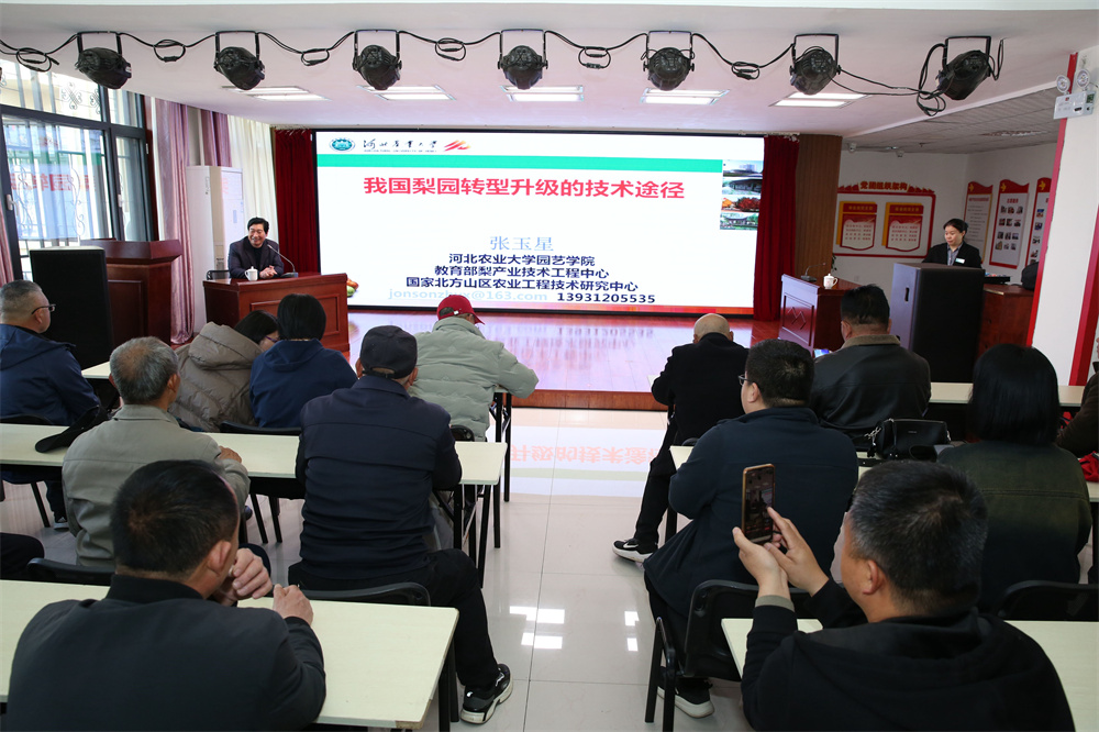 培训会邀请到国家园艺学会梨分会理事长、河北省果树学会理事长、河北省梨工程技术研究中心创建者负责人、河北省梨创新团队首席专家、河北农业大学张玉星教授(二级),河北省梨创新团队绿色防控专家、河北省政府特殊津贴专家、河北省植保总站李令蕊推广研究员进行技术培训。张玉星教授首先就中国梨产业现状、梨园转型升级的迫切性、转型升级的途径、老龄低效梨园改造技术进行了讲解;李令蕊推广研究员就梨产业情况、科学安全使用农药、梨树主要病虫害防控技术进行了讲解;培训会上还进行互动交流,两位专家就果农关心的难点和热点问题进行详细解答。