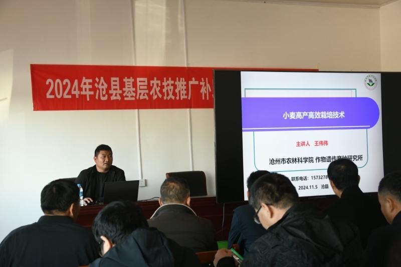 11月5日上午,应沧县农业农村局邀请,作物遗传育种研究所副所长、国家小麦产业技术体系沧州综合试验站站团队成员王伟伟副研究员到沧县南堤村春润农业合作社对沧县基层农技人员培训《冬小麦品种选择及高产栽培技术》,讲述了旱地栽培技术、水地栽培技术以及关键生育时期如何开展田间管理,结合实际讲解了冬前春后苗黄的原因、预防以及措施等技术。种植大户、合作社成员以及新型经营主体共计60人参加。培训取得良好的效果。