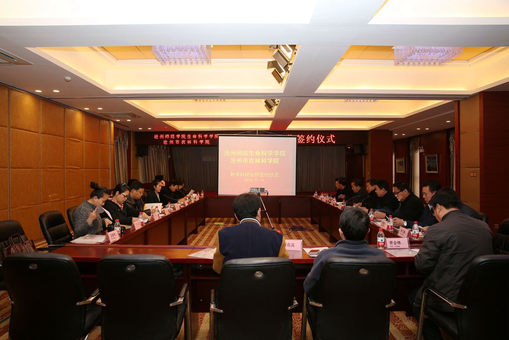 2016年11月11日,沧州师范学院生命科学学院和e77乐彩关于科研教学合作协议签字仪式在我院举行。沧州师范学院生命科学学院刘福春院长,师院科研处王建珍处长、部分教师代表,农科院阎旭东副院长、王奉芝副院长及专家代表出席了签字仪式。