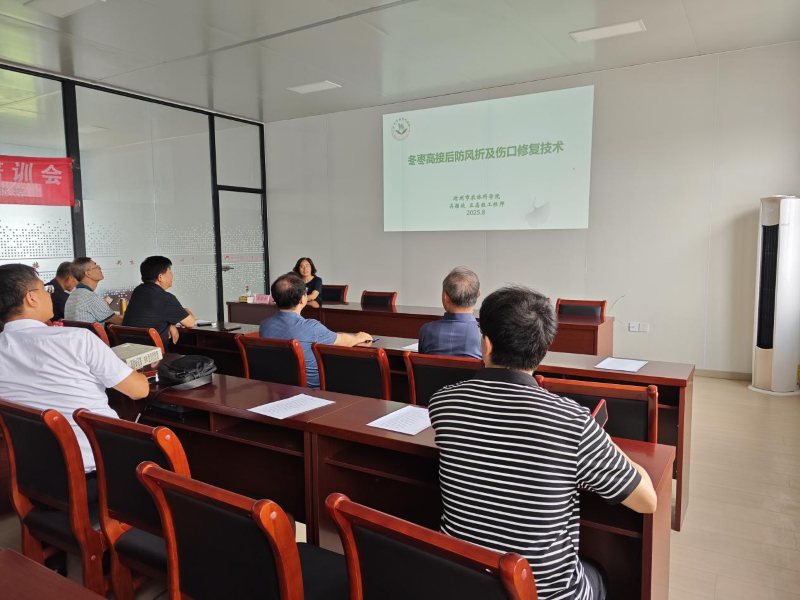 随后,我院正高级工程师吴颖欣针对冬枣高接后防风折及伤口愈合保护技术进行了重点讲解。详细介绍了枣树高接后通过支架搭建及枣头绑缚,可有效防止风折及引导枣头有序生长,加速树形成形;对甲口涂抹果树伤口修复剂,能够彻底解决高温季节果树伤口难以愈合的问题,并可以有效控制皮暗斑螟危害。并展示了一些实际应用案例,让参会人员更加直观地了解这些技术的应用效果。