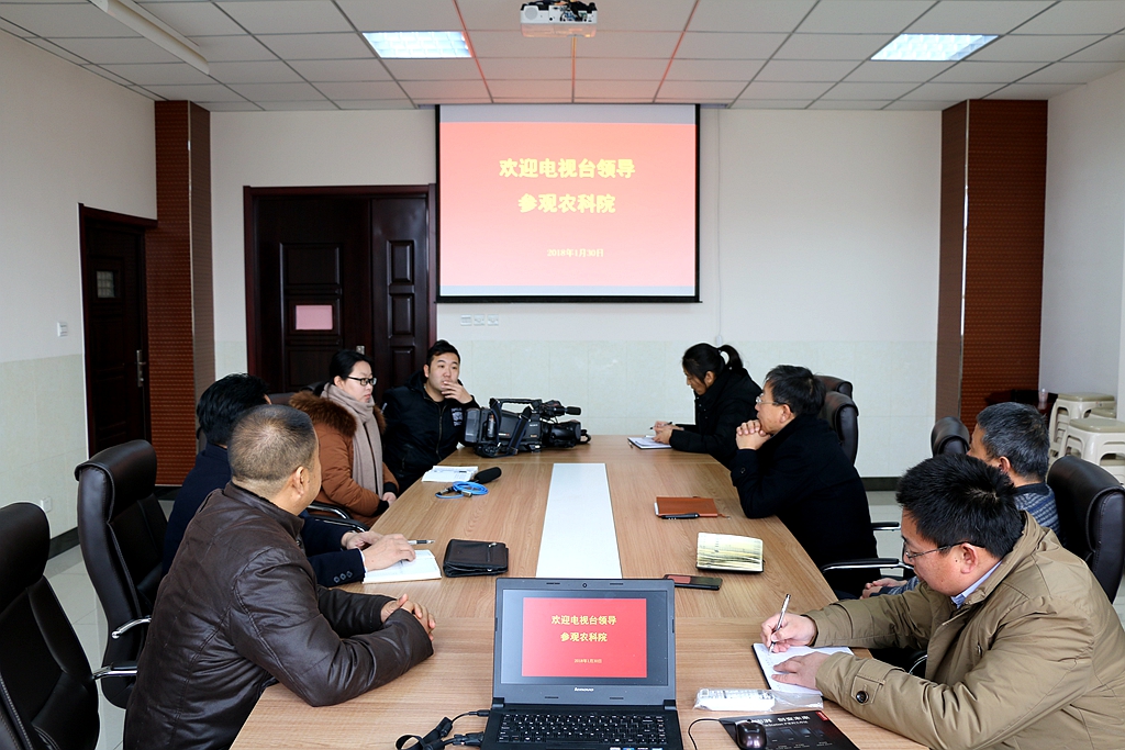 阎院长在会议室向记者介绍了我院的基本概况、专业特色、科研成果、平台建设。重点汇报了我院开展的抗旱耐盐丰产优质作物新品种选育、旱作节水栽培技术、特色林果品种选育及栽培技术、地下害虫防治及利用等工作。