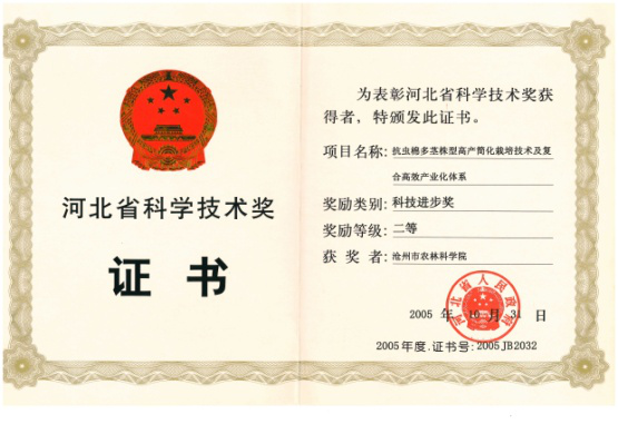 承担国家及河北省科技攻关项目,针对抗虫棉“库强源弱易早衰”、整枝繁、效率低的问题,创新抗虫棉多茎株型高产简化栽培新技术,变“封堵”型精细整枝为利用叶枝“疏导”型简化管理,节省整枝用工70%,亩增效益300元;创新棉花+天鹰椒、棉花+土豆、棉花+花生高效种植模式,经济效益提高1.8倍,水份利用效率提高1.7倍,列入河北省、沧州市重大科技成果推广项目,三年累计推广面积434万亩,创社会效益8.9亿元,2004年获沧州市科技进步一等奖2005年获河北省科技进步二等奖。