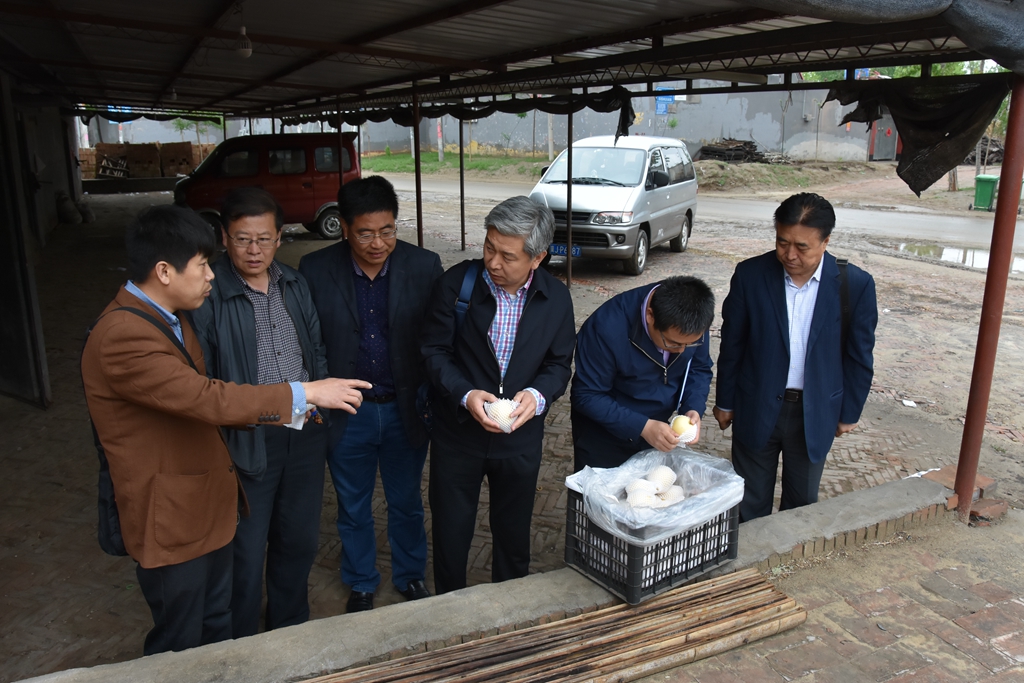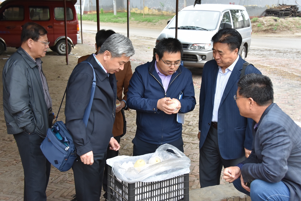 4月22日,省农林科学院理化所所长、国家梨产业岗位专家、博士生导师关军锋研究员、省水果产业体系贮藏保鲜及加工岗位专家程玉豆博士就黄冠梨水烂病发生情况及田间管理到沧州肃宁开展调研指导。