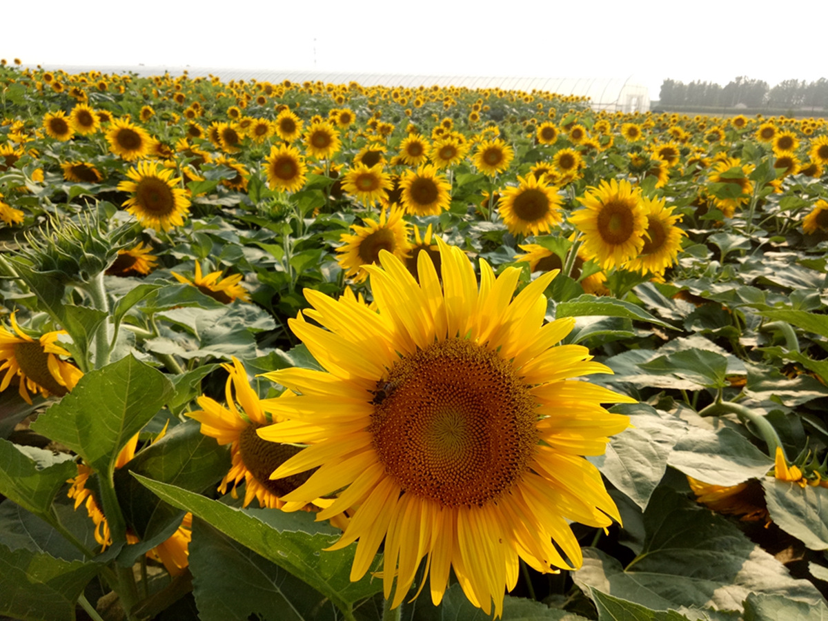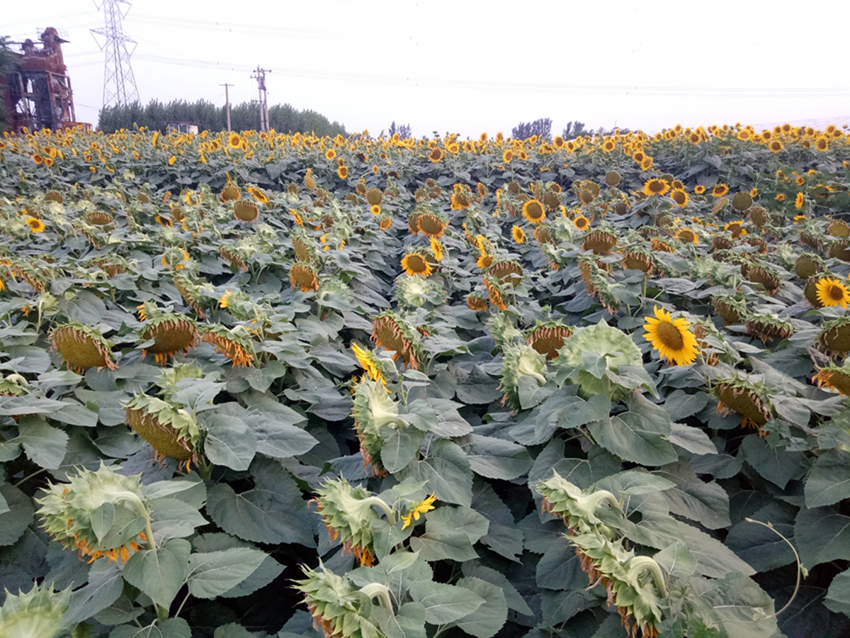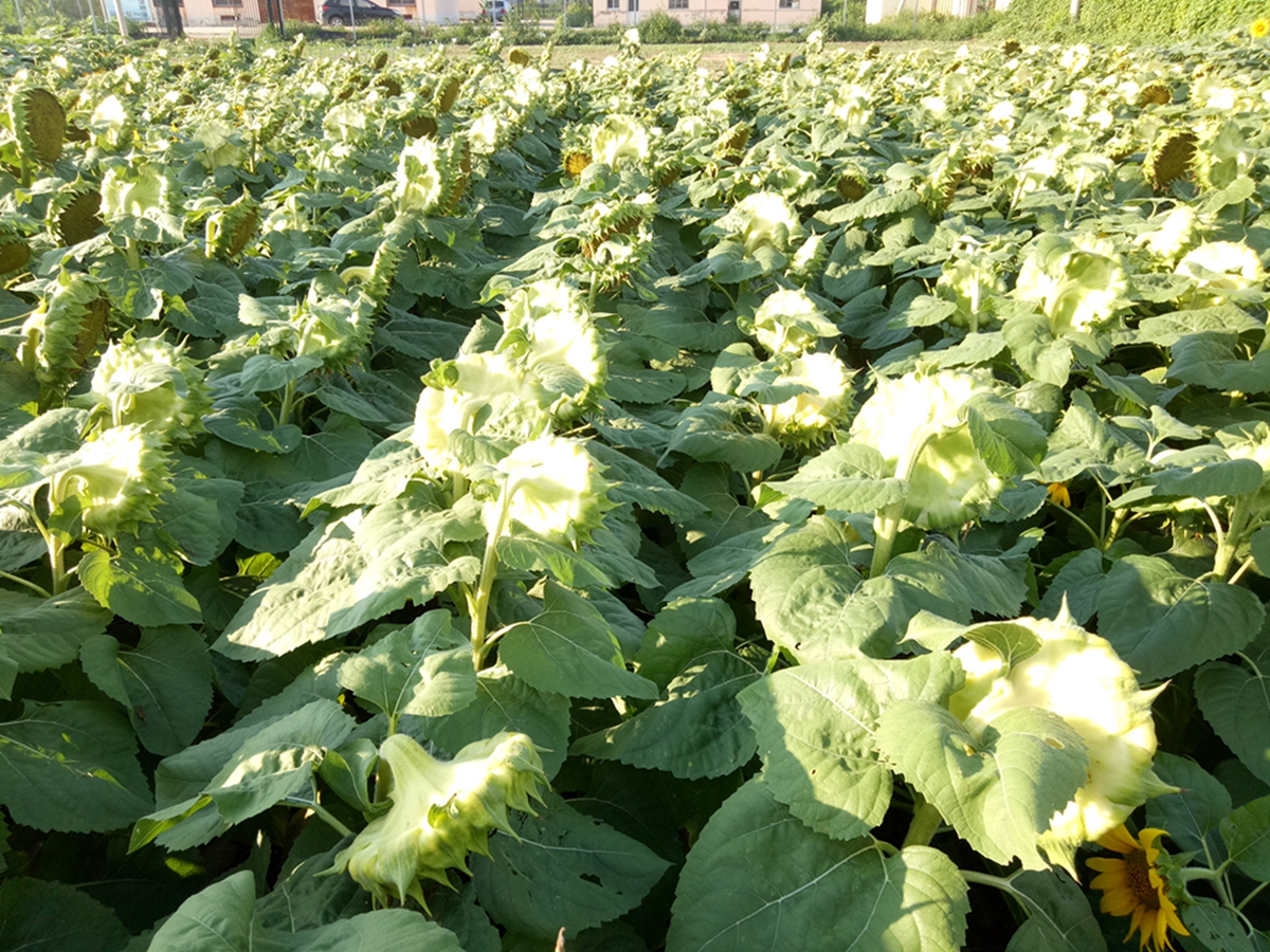 现在正值油葵开花灌浆期,葵花朵朵绽放,灿烂美丽,今年油葵共引进了国内外9个新品种,田间各品种之间在性状上表现出明显的差异性,通过对生物学性状、农艺性状和经济性状的比较,筛选出适合我们当地的种植品种,同时对油葵上的常见病虫害进行了调查,今年主要虫害有黄地老虎、棉铃虫,主要病害有菌核病、褐斑病。